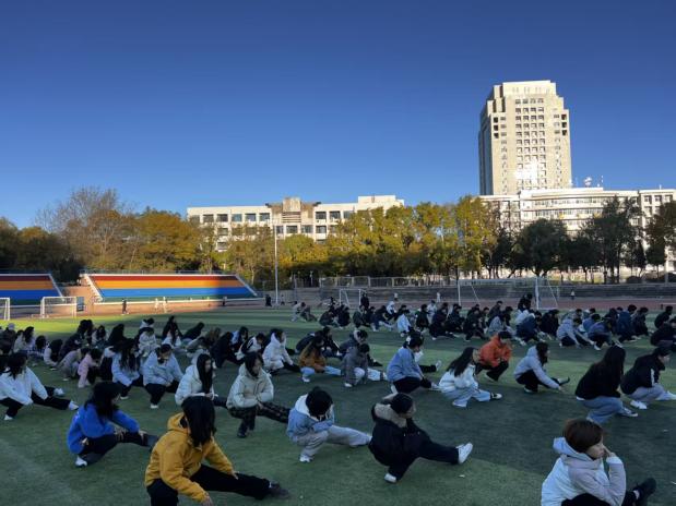 步履生风,跃动青春。体育场热身环节,伸展的身影与天际线构成剪影,见证着学子的朝气蓬勃。