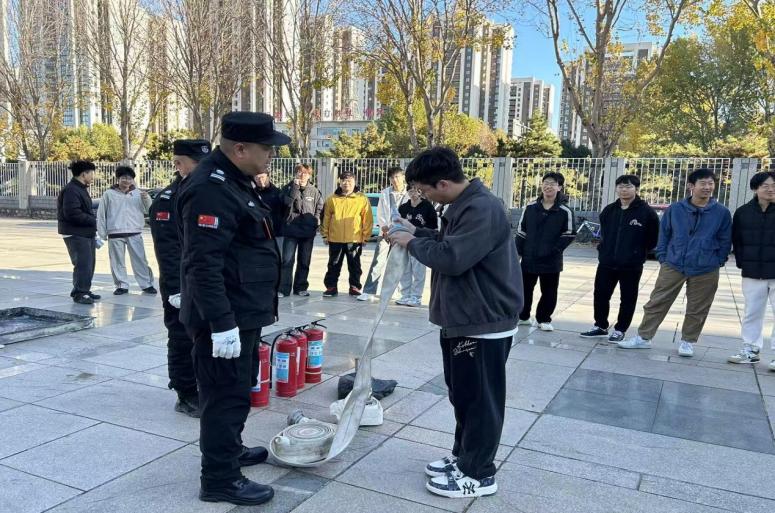 活动伊始,安全工作处工作人员在现场为同学们科普消防知识,通过讲解消防器材原理、演示操作流程,帮助大家掌握器材辨识方法与规范使用技巧。实操环节中,学生们积极上前,在工作人员指导下依次完成消防水带连接、灭火器灭火模拟等实操项目,在实战化场景中有效提升了消防安全实操技能。