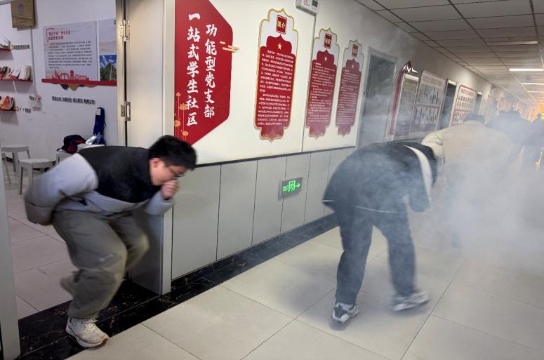 “模拟烟雾通道逃生”环节模拟烟雾弥漫的火灾现场环境,参赛队员在引导员安全提示下,弯腰低姿捂口鼻、沿墙快速有序穿越,途中互相协助、严守逃生规范,顺利完成“脱险”。学生们在沉浸式体验中掌握正确逃生方法,提升火灾应急反应能力。