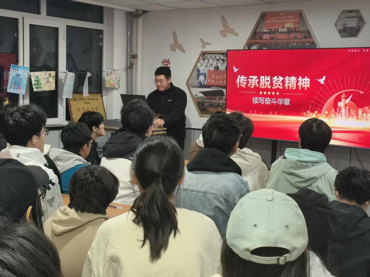为引导学生厚植家国情怀、勇担时代使命,深入学习传承脱贫攻坚精神,2025年11月8日,一站式学生社区开展“弘扬脱贫攻坚精神,续写奋斗青春华章”主题教育活动。活动由机械工程学院本科生第一党支部党员黄鑫主讲,本科生第六党支部20名入党积极分子参加。