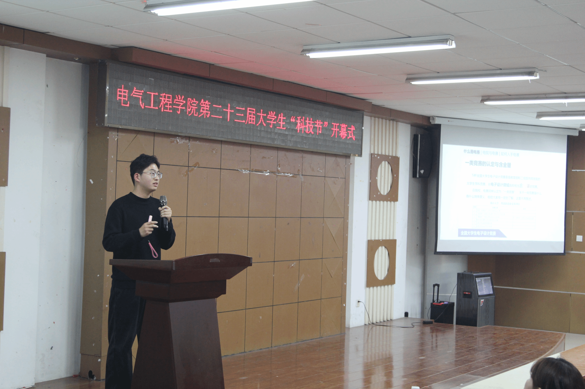 科技节在院长郭小强宣布“电气工程学院第二十三届科技节正式开幕”声中正式拉开帷幕。郭院长以优秀毕业生为例,鼓励同学们夯实专业基础,勇于创新实践。他指出,这些校友的成长轨迹充分证明,个人的发展只有与国家和时代的需求同频共振,才能绽放最耀眼的光彩。 他勉励在场同学,要珍惜科技节这个展示自我、锻炼能力的平台,将课堂所学与动手实践相结合,敢于奇思妙想,勇于挑战前沿,努力成长为推动科技进步和社会发展的栋梁之才。