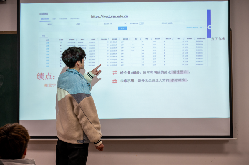 分享会以“大学成绩单”为开篇,钱知渐通过展示校内成绩系统界面与年级综测表,直观解读了绩点与综测的内容和意义。谈及活动与组织,钱知渐用“利弊清单”为新生厘清选择逻辑:参加喜欢的活动和组织能拓展兴趣、锻炼沟通能力,但‘氛围大于内容’的组织只会消耗时间,需把精力放在‘能真正学到东西’的活动与组织上。