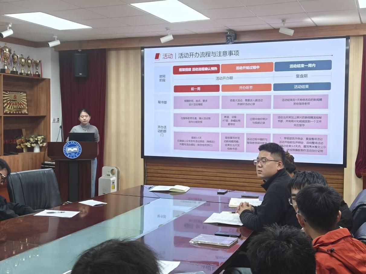 为加强各部门间的交流,增强团队凝聚力和执行力,提升全体成员的专业能力。11月16日,机械工程学院学生学习与发展指导中心在机械馆327召开全体例会暨技能培训大会。组织全体成员及指导老师陈嘉硕,学院辅导员赵子琪、张明阳参加本次会议。