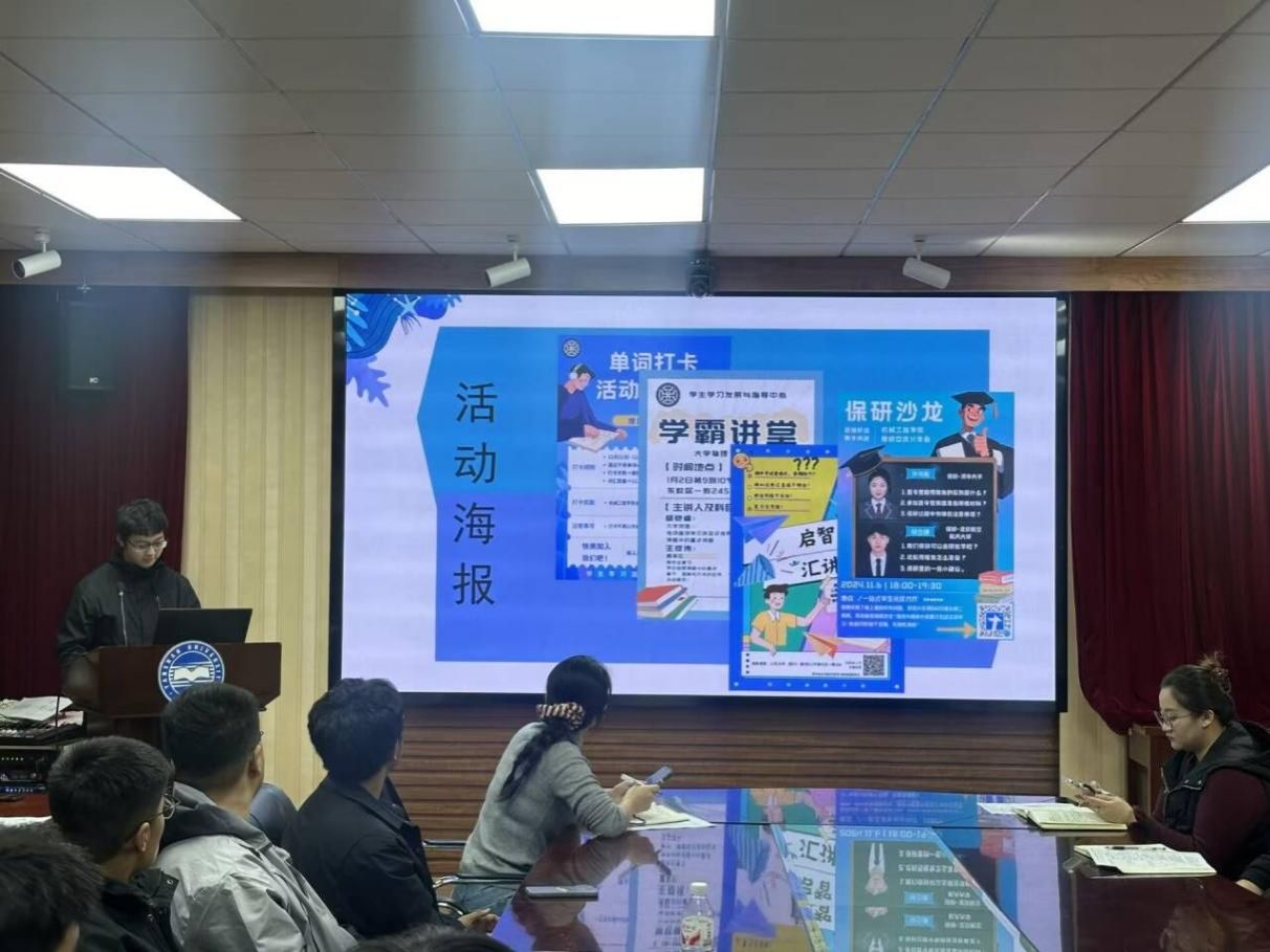 随后,各部门部长代表依次发言,初心部周川皓介绍“初心工程”和“学者下午茶”系列活动,学业部薛凯博介绍“学霸讲堂”“风华启航计划”等系列活动;发展部刘蓬勃介绍“学霸笔记”“保研沙龙”等活动;秘书部芮强分享海报、PPT、推文制作经验,他们通过分享工作经验、介绍部门核心职能、传授工作方法技巧等助力新成员明晰工作重心、快速融入组织,为新部员提升技能、夯实能力提供了重要参考。