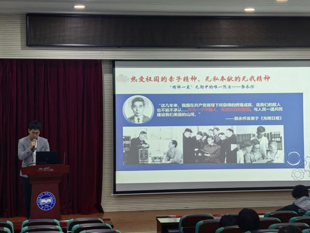 “干惊天动地事,做隐姓埋名人。”为传承弘扬“两弹一星”精神,引导青年学生在回望峥嵘岁月中坚定理想信念,11月16日,机械工程学院团委组宣部在学院J3报告厅成功举办首期“大学生讲团课”主题活动。活动以跨越时空的精神对话为载体,推动红色基因深度融入青春血脉,由学院团委组宣部部长孙睿博主讲,200余名青年学子现场参与学习。
