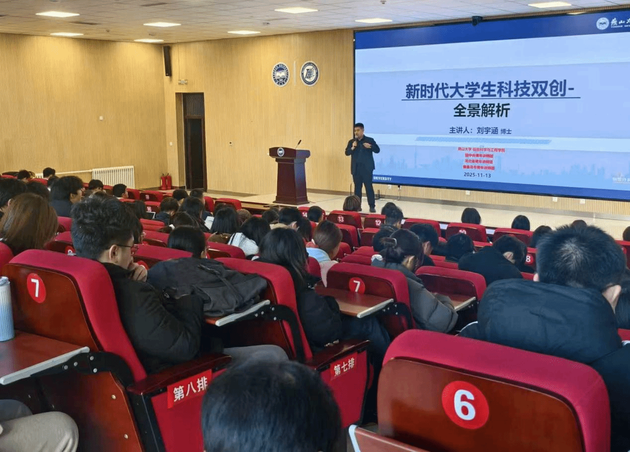 刘宇涵老师以“从虚拟到现实:我的科创与创业之路”为线索,分享了大学期间从参与科创项目到创立视翼科技的经历——从最初的技术探索,到攻克工业仿真算法难题,再到获30余项国内外奖项的过程。他强调,青年科创需兼具“好奇心与韧性”,即使面对失败也要持续迭代,并鼓励学生“在热爱的领域闯出一片天地”。现场展示的媒体报道与荣誉案例,让新生直观感受到科创实践的价值,进一步激发了投身创新的热情。