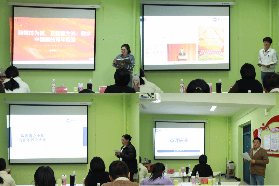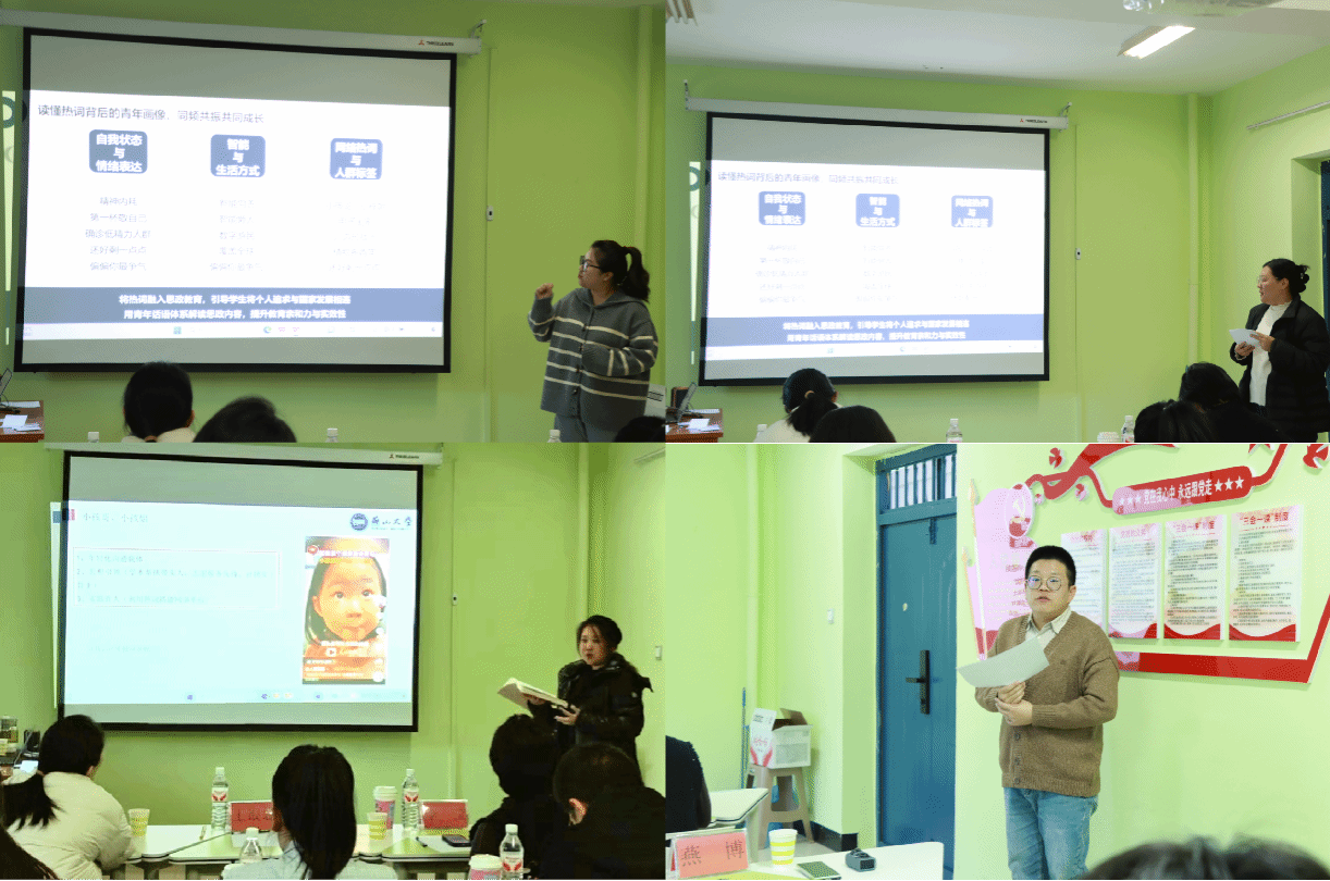 在随后的“解码青春盲盒”环节,辅导员团队通过释义“偏偏你最争气”、“六边形战士”等Z世代热词,探索如何用青年话语体系增强思想政治教育的亲和力。燕博老师在点评中强调了解码热词的意义,他强调辅导员要将这些热词有效融入日常思政教育,真正实现与学生的“同频共振”。