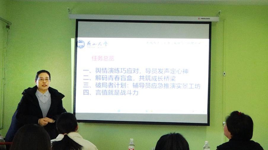 活动伊始,学生工作处副处长王银思老师发表讲话。她指出本次培训内容的设计紧密贴合辅导员工作实际需求,具有较强的实用性与前瞻性,并强调,辅导员应该加强学习,努力做好“输入”和“输出”,同时鼓励全体辅导员要沉浸式参与培训,在实践中不断提升处理突发事件的能力。