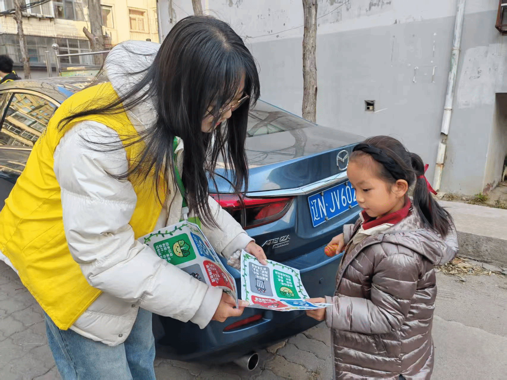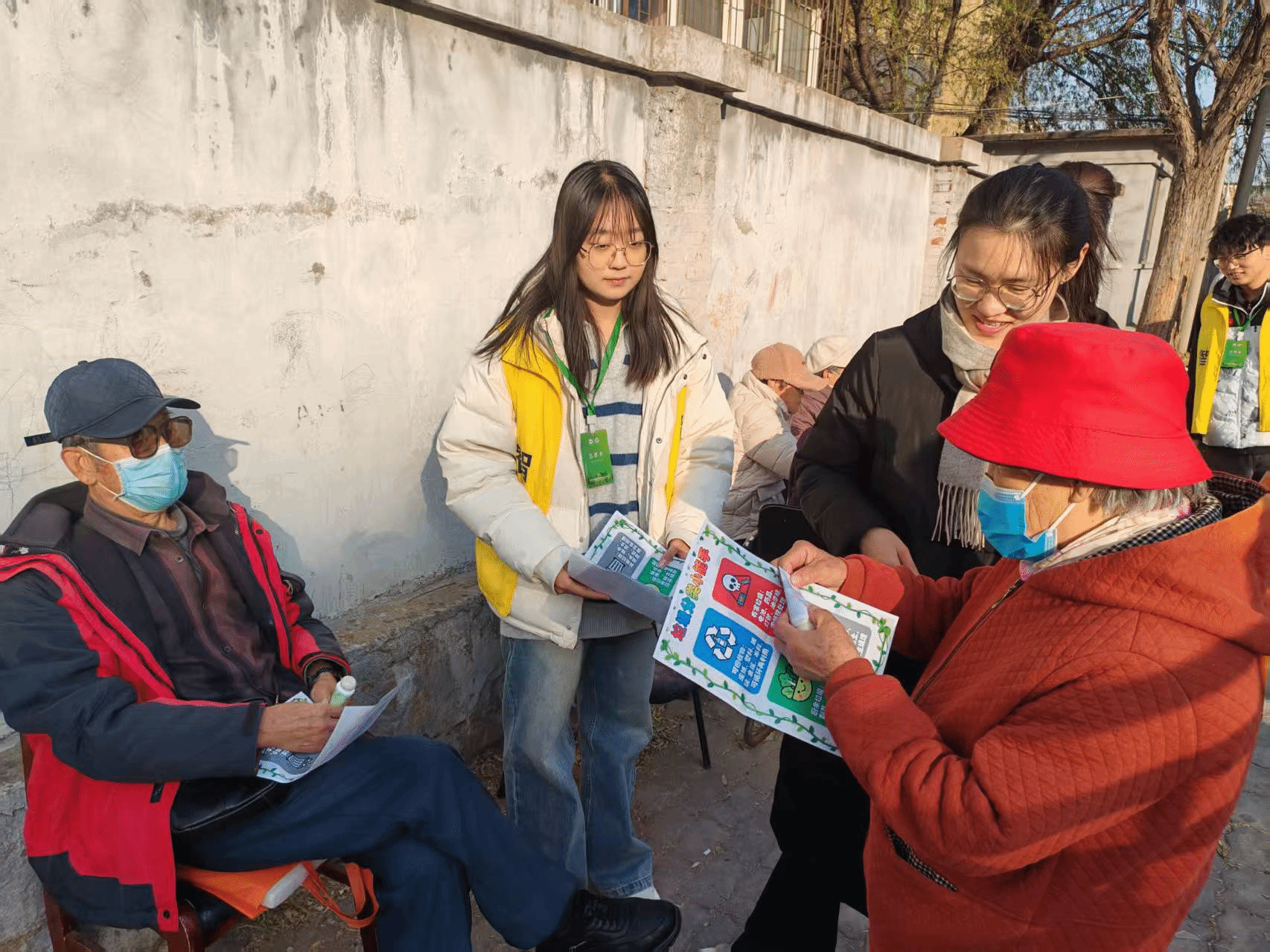 志愿者与居民互动并讲解垃圾分类知识
