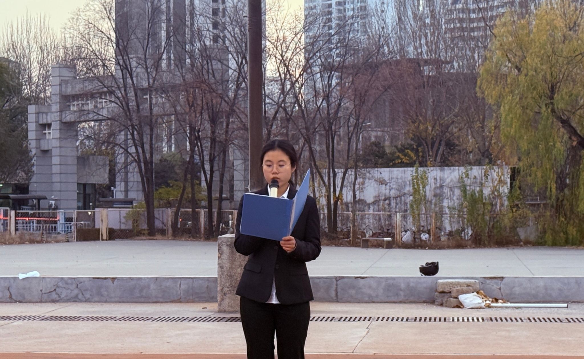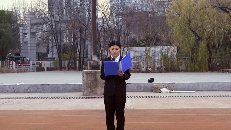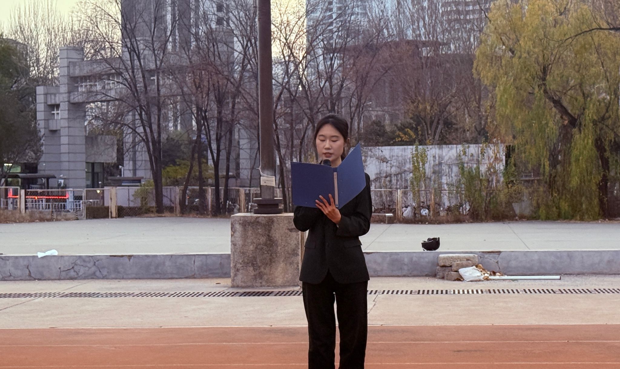 仪式第二项,学生代表段晨曦带来国旗下演讲——从祖国发展的辉煌成就,到青年肩负的时代使命,号召同学们以专业为笔、以实干为墨,在青春赛道上奋力奔跑。