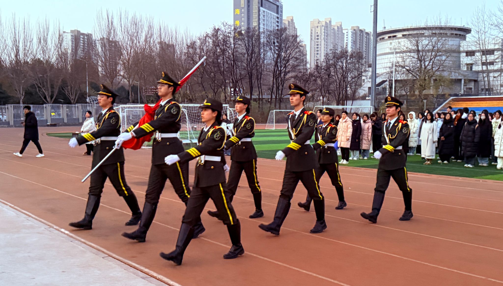 天色微明,国旗护卫队队员迈着整齐有力的步伐,护送五星红旗走向旗杆。伴随《义勇军进行曲》的激昂旋律,国旗迎着晨光冉冉升起,全场师生肃立、齐唱国歌,以庄重的注目礼,传递对祖国的赤诚敬意。