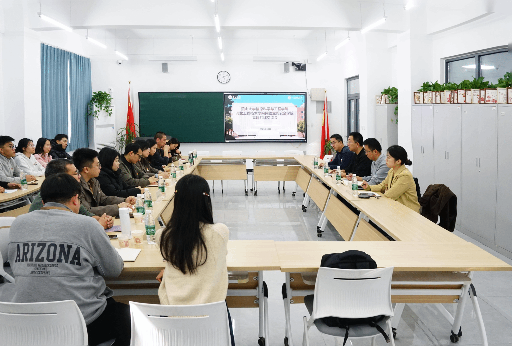 11月28日,为共同探索新时代高校育人工作新路径,燕山大学信息科学与工程学院辅导员一行,在学院党委副书记李浩然的带领下,应邀赴河北工程技术学院网络空间安全学院开展党建与学生工作专题交流。河北工程技术学院网络空间安全学院党总支书记樊风彩、团支部书记崔健,辅导员及学生党员代表参与交流活动,分享经验,共谋发展。