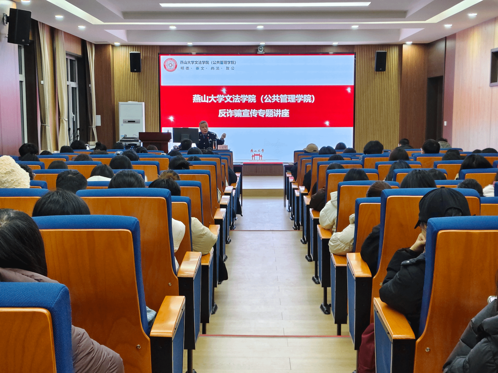 为筑牢校园安全防线,切实提升学生防范网络诈骗的意识和自我保护能力,文法学院(公共管理学院)12月10日在人文馆114会议室举办反诈骗宣传专题讲座。讲座特邀曾获“中国好人”“河北最美退役军人”等荣誉称号的秦皇岛市公安局燕园派出所民警王宝军担任主讲嘉宾。学院辅导员代表和学生代表参加本次讲座。