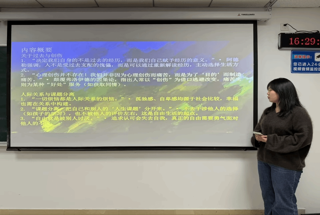 思想分享环节中,同学们各抒己见、观点鲜明,展现了深刻地思考与独到的感悟。有同学深入解读“共同体感觉”与幸福的内在关联,阐明自我接纳并非自我放任,他者贡献绝非刻意讨好,而是个体获得归属感、实现自我价值的核心路径;还有同学系统串联书中关键观点,清晰梳理出“勇气-自由-幸福”的逻辑闭环,指出书籍的核心价值在于为当代青年赋能,助力打破心理桎梏、实现成长突破。