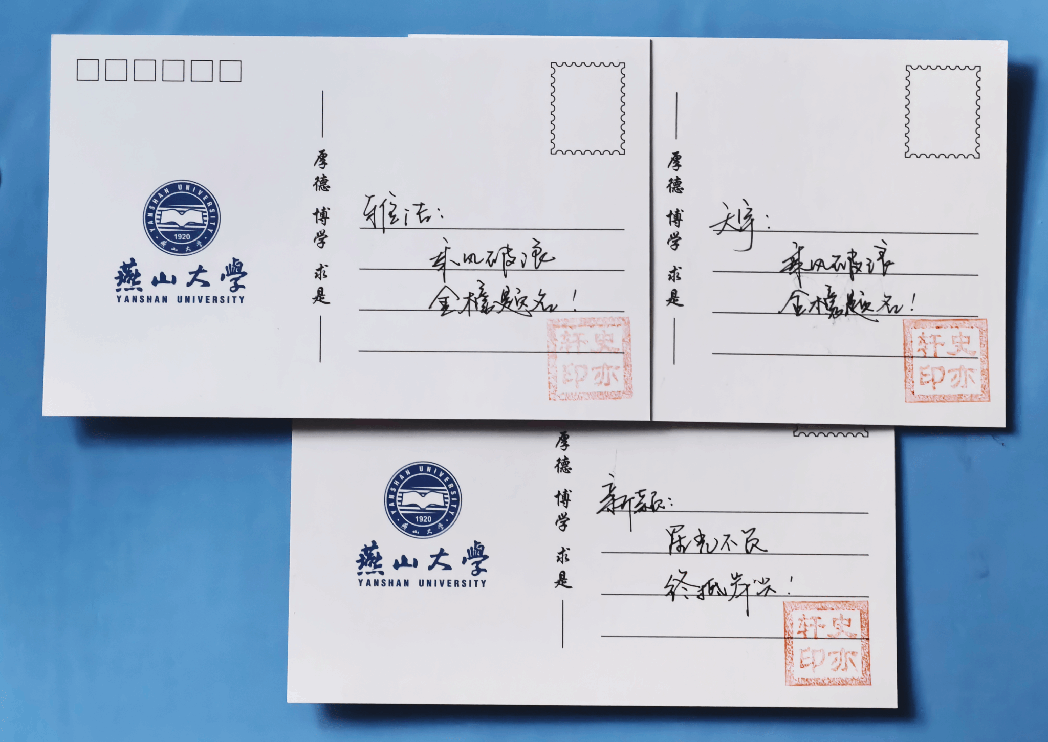 让学子们感动的是,学院为每位考研人独家定制了校园风景主题助威卡片。卡片正面印有燕山大学标志性景观,背面则手写了学生的姓名与专属祝福语,并同时加盖辅导员个人印章。一枚枚红印,象征着师长与学子并肩作战的承诺,也成为这个冬天最暖心的“加油符”。