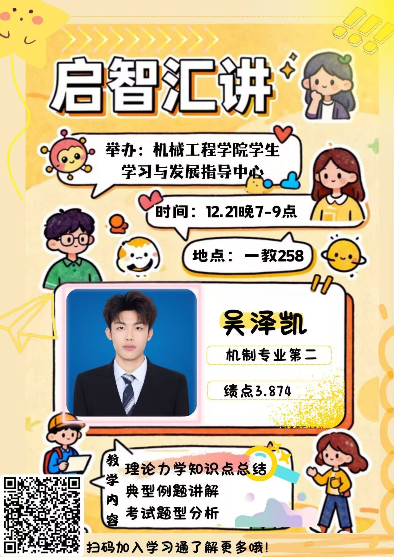 为进一步加强学院学风建设,激发机械工程学院学生学习热情,机械工程学院学生学习与发展指导中心于2025年12月21日,在东区一教258教室成功举办了理论力学启智汇讲活动。此次活动吸引了众多学生积极参与,现场学习氛围浓厚,展现了机械工程学院学子积极向上的学习风貌。