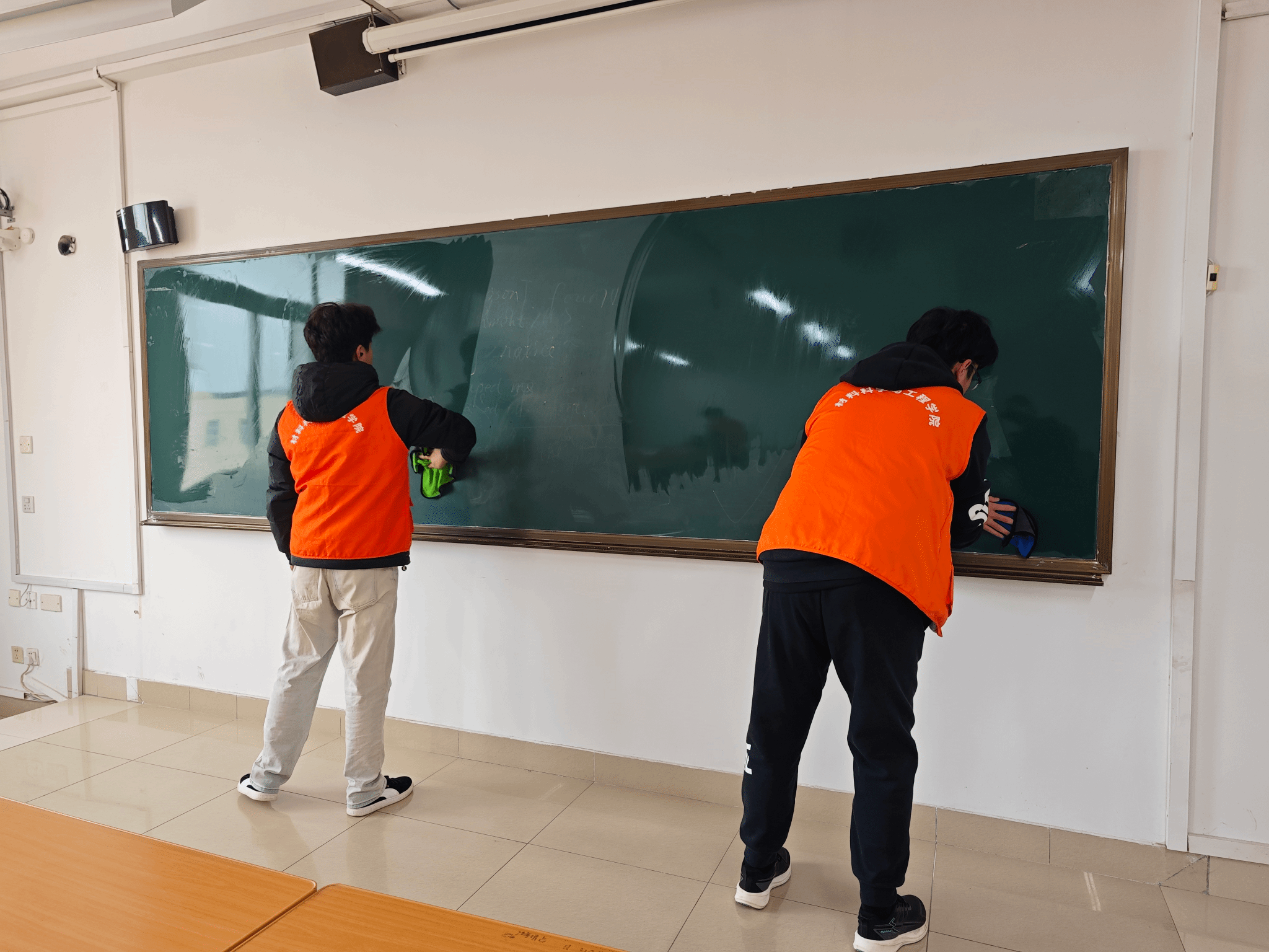 在教学楼,志愿者坚持“以劳育德、志愿为美”,细致清扫地面、擦拭黑板讲台、规整课桌椅,让一间间教室窗明几净、书香氤氲,为新学期注入清新与温度。