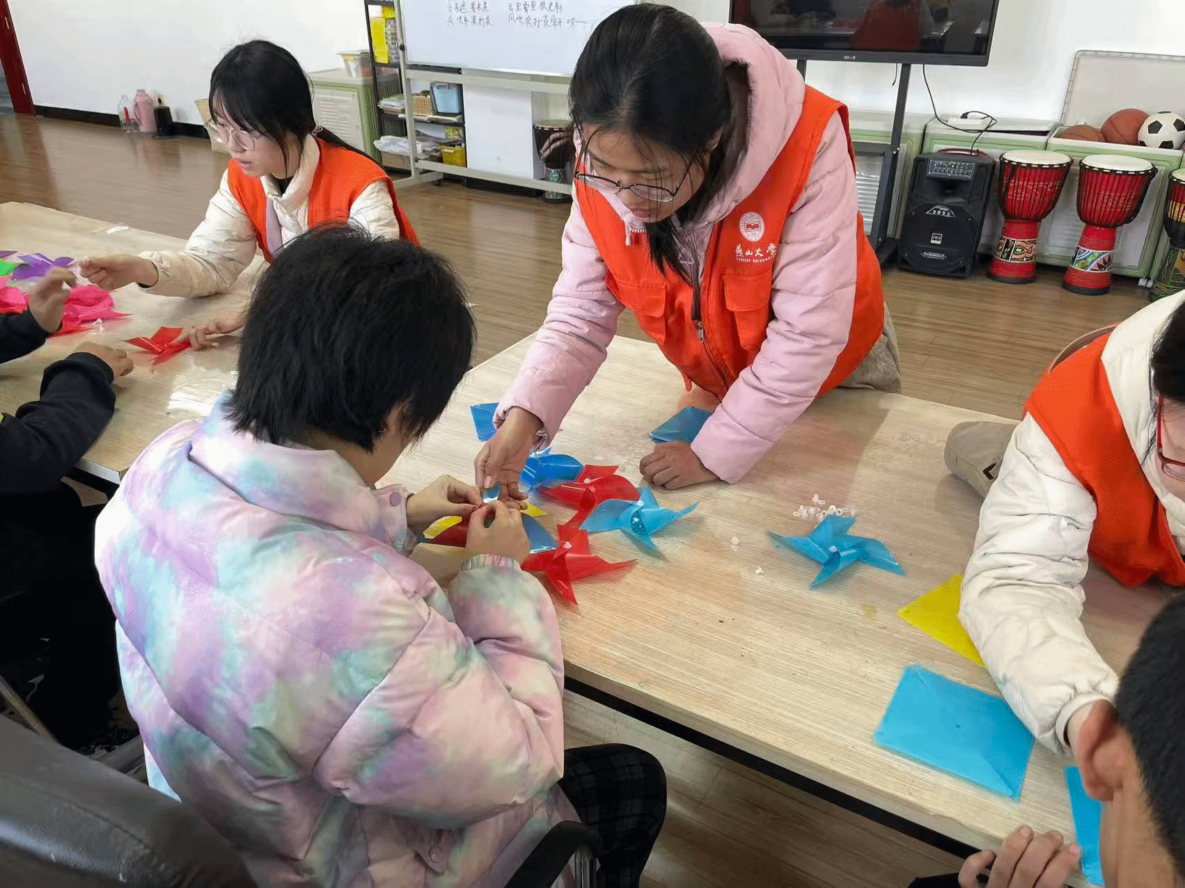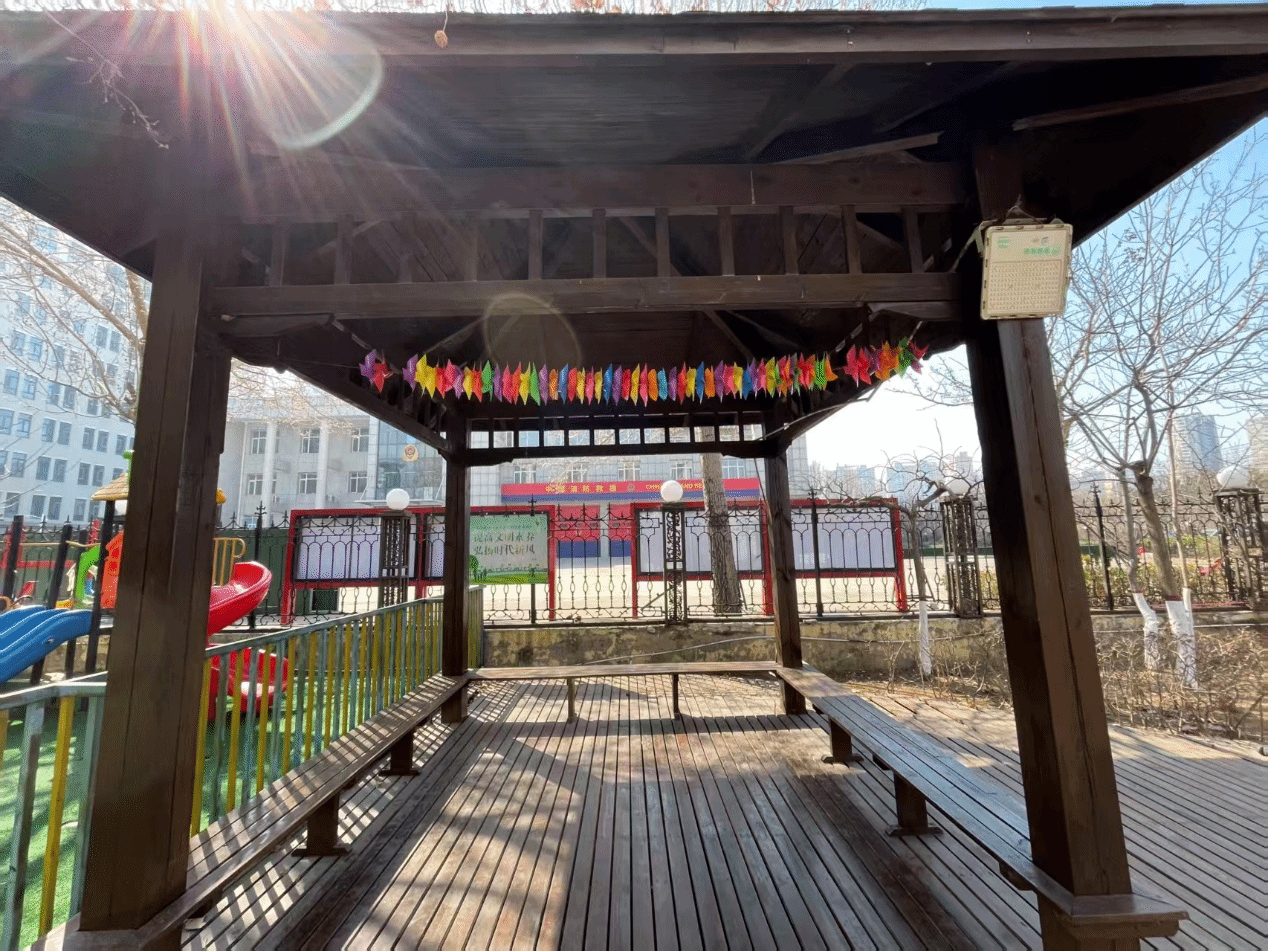 在“风车传情”手工创作阶段,志愿者们分组陪伴孩子们协作制作简易风车。一只只色彩斑斓的风车在春风中转动,不仅点亮了孩子们的好奇心,也串联起彼此的心意。完成后,大家将风车细心串连,悬挂于活动场地的亭子边,微风拂过风车轻转,场面灵动而美好。