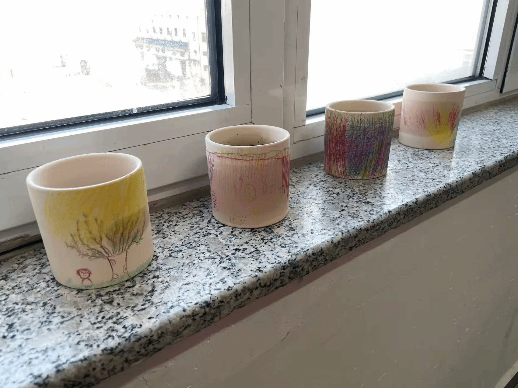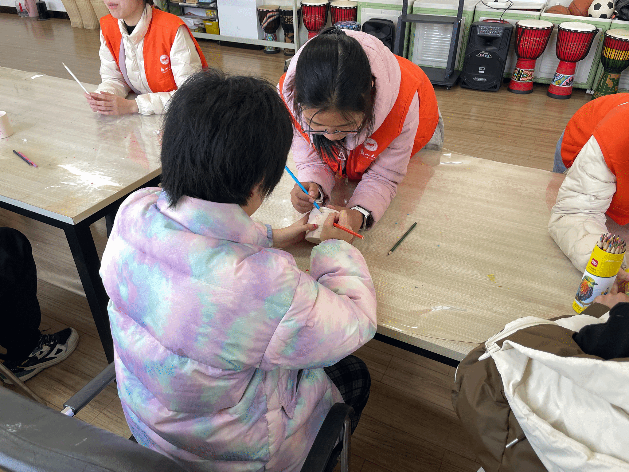 随后的“绿意萌发”盆栽制作环节,孩子们在志愿者的引导下,用彩铅在白色花盆上描绘出小花、星星、小动物等充满童真的图案。随后,大家一同装土、播种、浇水,将亲手绘制的花盆变成了孕育希望的小小花园。一排排整齐摆放在窗台上的盆栽,在阳光下静待生命萌发,象征着爱与成长的力量。