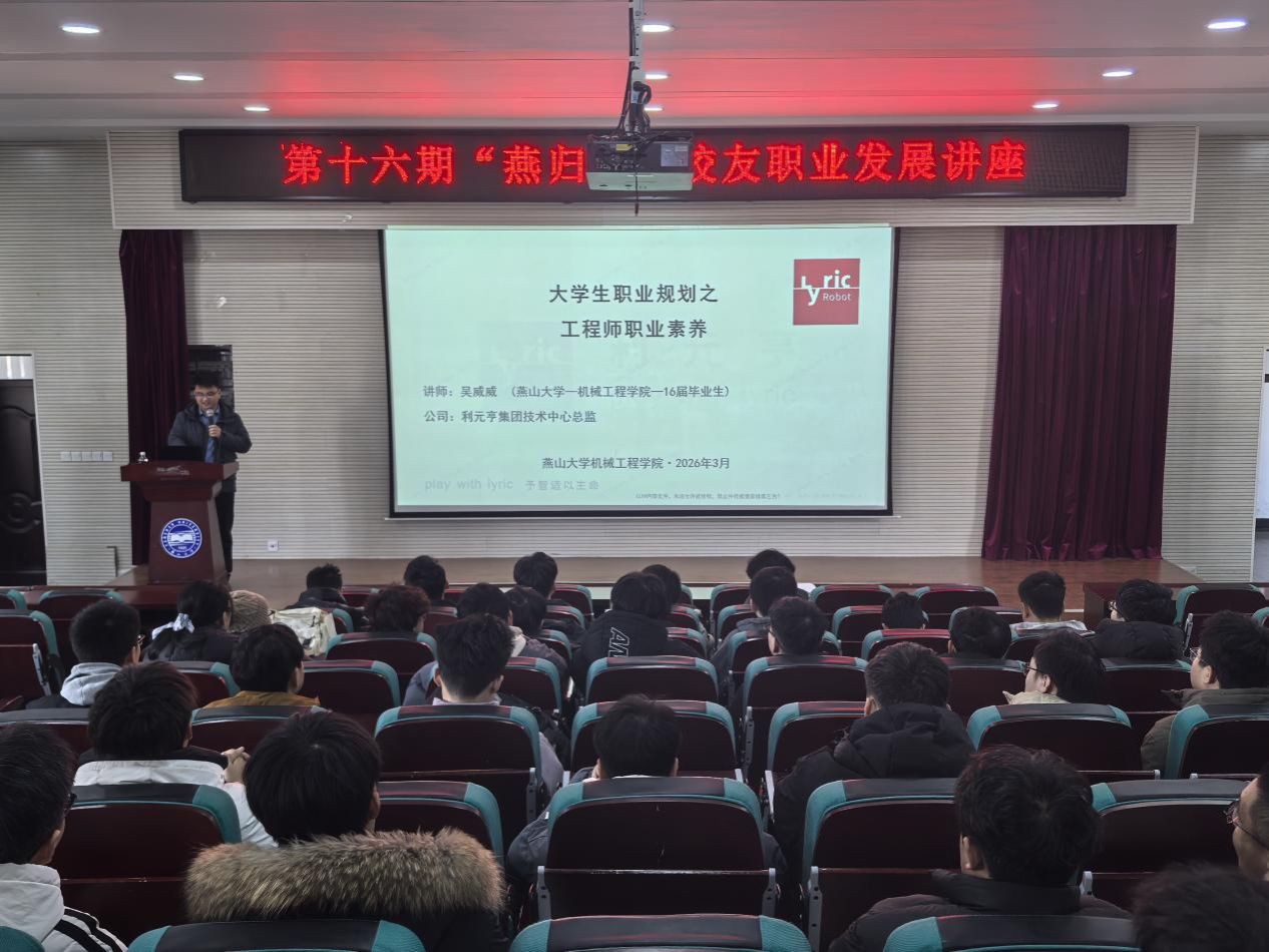 2026年3月13日,机械工程学院于机械馆J3举办第十六期燕归巢校友职业发展讲座。本次讲座邀请到机械工程学院2016届毕业生现利元亨集团研发中心总监吴威威担任主讲。学院就业负责人、毕业班辅导员和学生代表参加本次活动。