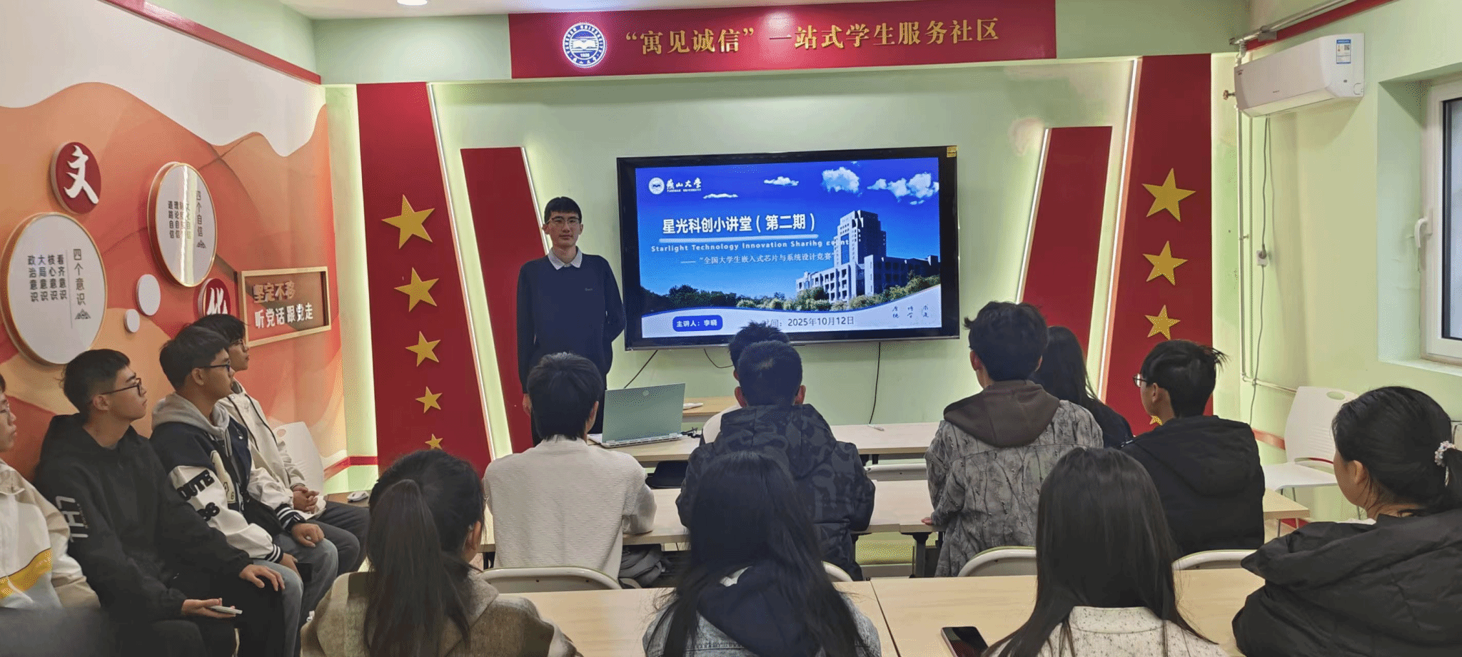 为全面落实科技强国战略部署,帮助学生筑牢正确专业认知与学习理念,进一步培养创新思维、提升科普素养。燕山大学信息科学与工程学院(软件学院)于10月12日下午在“寓见诚信”一站式学生社区开展了第二期星光科创小讲堂活动,活动主题为“嵌入式芯片与系统设计竞赛经验分享”。此次活动邀请了2024-2025年度国家奖学金、第八届全国大学生嵌入式芯片与系统设计竞赛全国总决赛二等奖获得者,2024级电卓班李晓同学为大家分享,25名对嵌赛感兴趣的本科同学参与此次科创小讲堂。