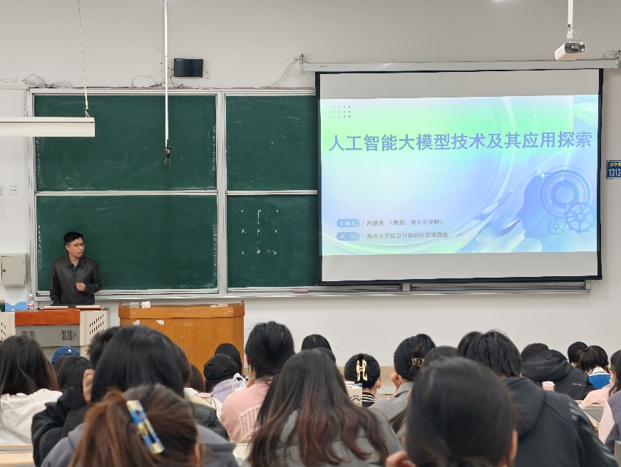 冯建周首先由人工智能与大模型的概念引入,讲解人工智能如何替代重复性脑力劳动,引导学生思考人工智能产生的必然性与重要性。通过以自身科研团队研究成果为切入点,结合课题组的具体案例拆解大模型的赋能路径,冯建周从专业角度说明人工智能的工作方式,帮助学生现场了解AI赋能效果。培训最后,冯建周带领现场同学共同畅想由大模型赋能的未来发展,展望大模型在多领域的渗透前景,并勉励学员坚守科技伦理、践行科技报国。