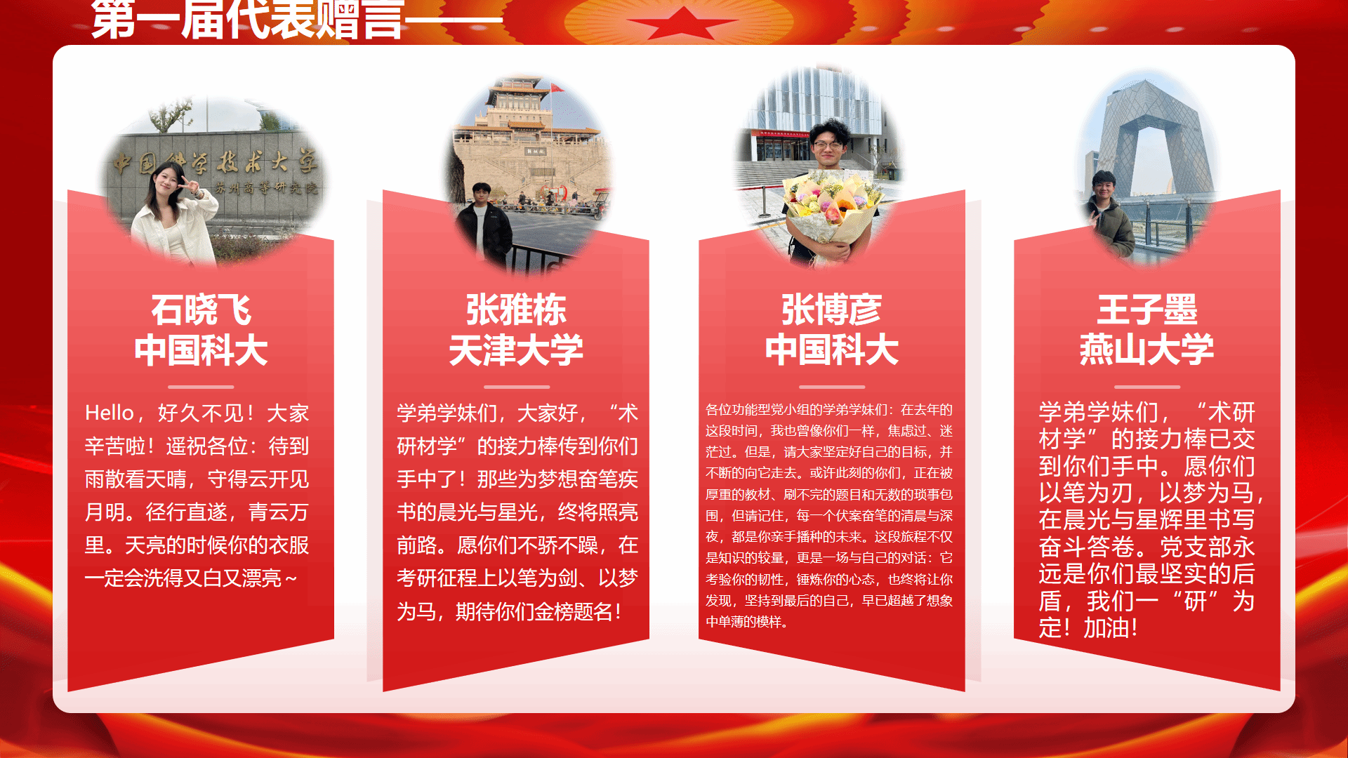 二届接受寄语,专业祝福暖心。换届仪式上,来自“前辈”的寄语成为最温暖的注脚。功能型党支部负责人董亮老师特别收集了现就读于中国科学技术大学、天津大学、燕山大学等高校的4名首届成员的文字赠言。字里行间既有对备考艰辛的共情,更有“坚定目标、坚持到底”的鼓励——“每一个伏案奋笔的清晨与深夜,都是你亲手播种的未来”,真挚分享让在场党员深受触动。