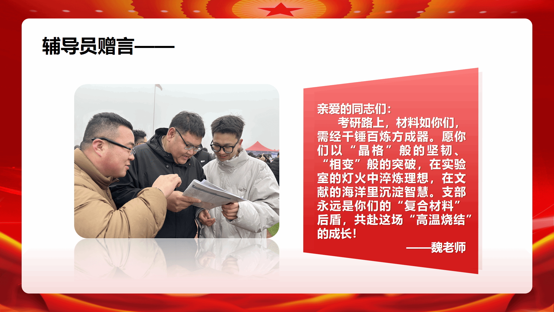 辅导员魏东老师则巧妙结合材料学科特色,送上“专业式寄语”:考研路上,材料如你们,需经千锤百炼方成器。愿你们以‘晶格’般的坚韧、‘相变’般的突破,在实验室的灯火中淬炼理想,在文献的海洋里沉淀智慧。生动形象的比喻既贴合专业学习实际,更传递出支部对考研党员的坚实支持,引发在场成员强烈共鸣。
