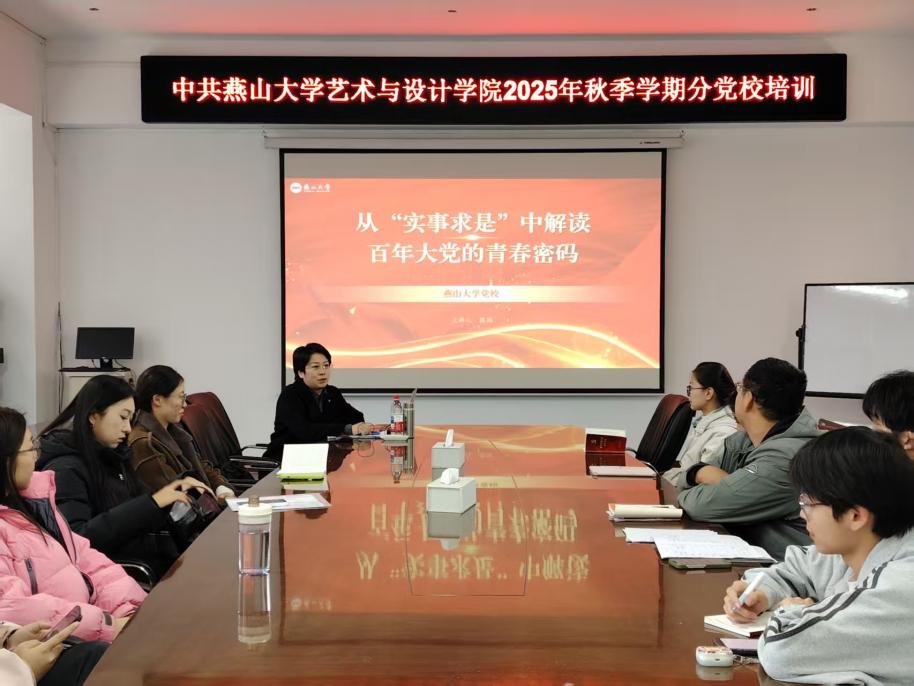 为深入学习贯彻习近平新时代中国特色社会主义思想,推动党史学习教育常态化长效化,10月23日,艺术与设计学院分党校在美术馆C305教室集中开展了以“实事求是:百年大党的青春密码”为主题的专题党课学习,学院分党校邀请张颖老师进行讲授。