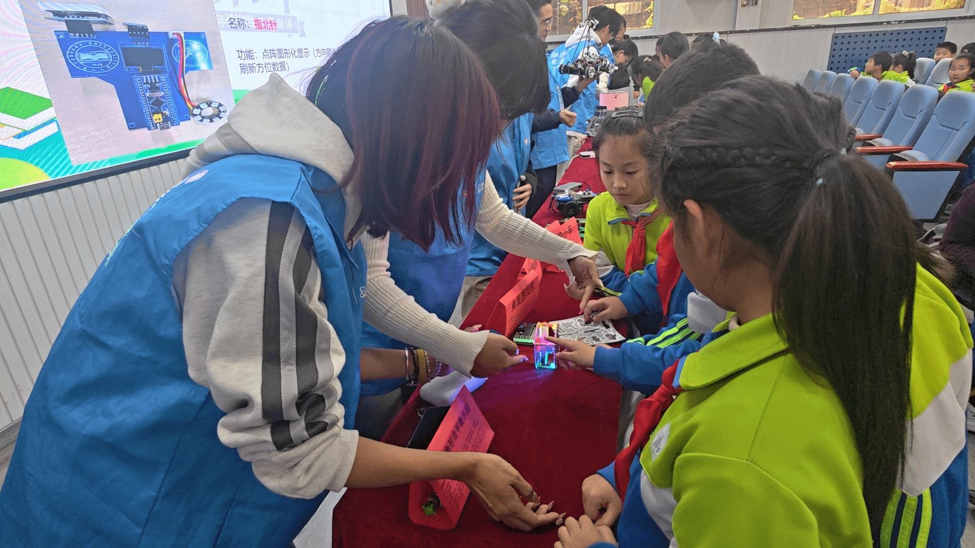 在多功能厅,学院电子科技协会的同学们与小学生结对参与科创实践,在共同组装、调试智能车的过程中互动协作,切身感受“科创筑梦强国有我,智慧科技引领未来”的实践内涵。现场还设置了互动问答环节,气氛热烈、欢呼声不断。