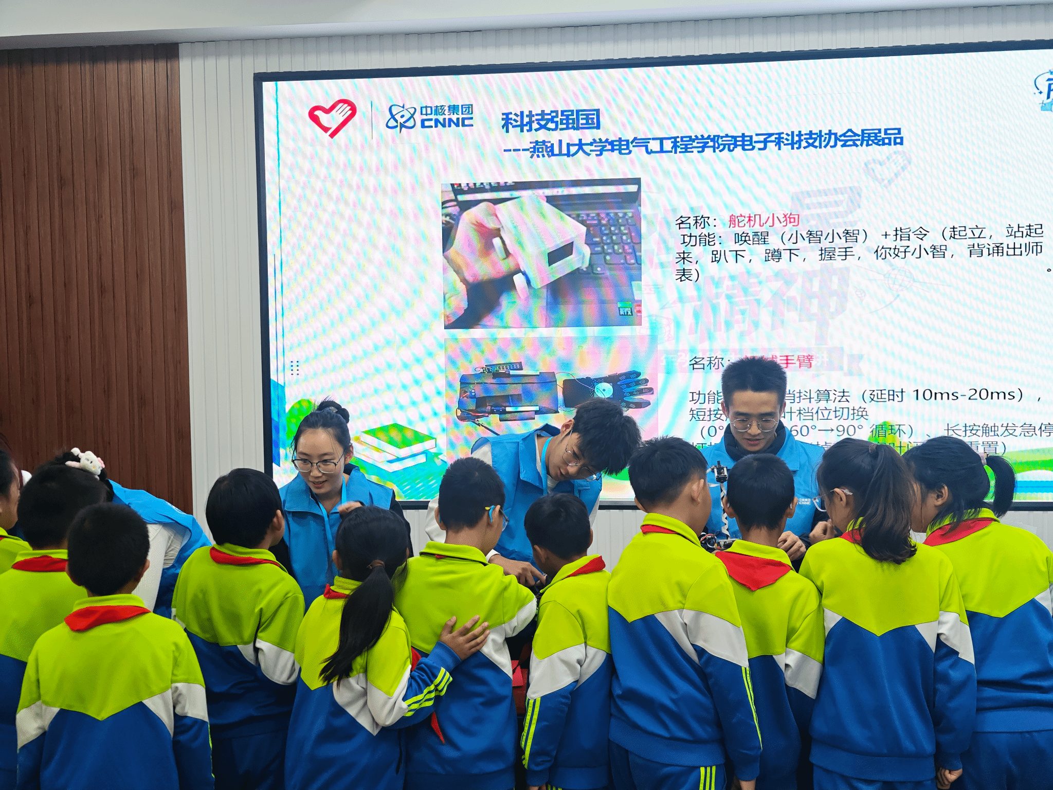 为推进大中小学思想政治教育一体化建设、凝聚跨学段育人合力,10月31日,燕山大学电气工程学院携精心遴选的优秀科创成果与创意作品,联合秦皇岛市阅读促进会将“红魂润童心科智燃梦想”共建活动带进秦皇岛市海港区耀华小学,以大学创新活力注入基础教育沃土。学院副处级辅导员张颖、团委书记刘凯,耀华小学书记校长党蕾、教学副校长张景然率双方师生代表参与活动。