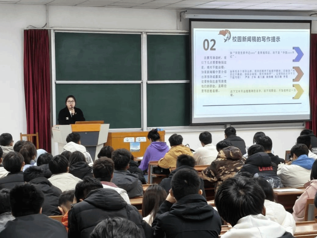 赵子璇老师系统讲解了新闻撰写的核心知识与实用技巧,从校园新闻的概念、特点、写作步骤到常见误区,层层深入,帮助同学们构建起清晰的新闻写作框架。现场学生认真聆听,积极思考,对新闻稿的规范撰写有了更为全面的认识。