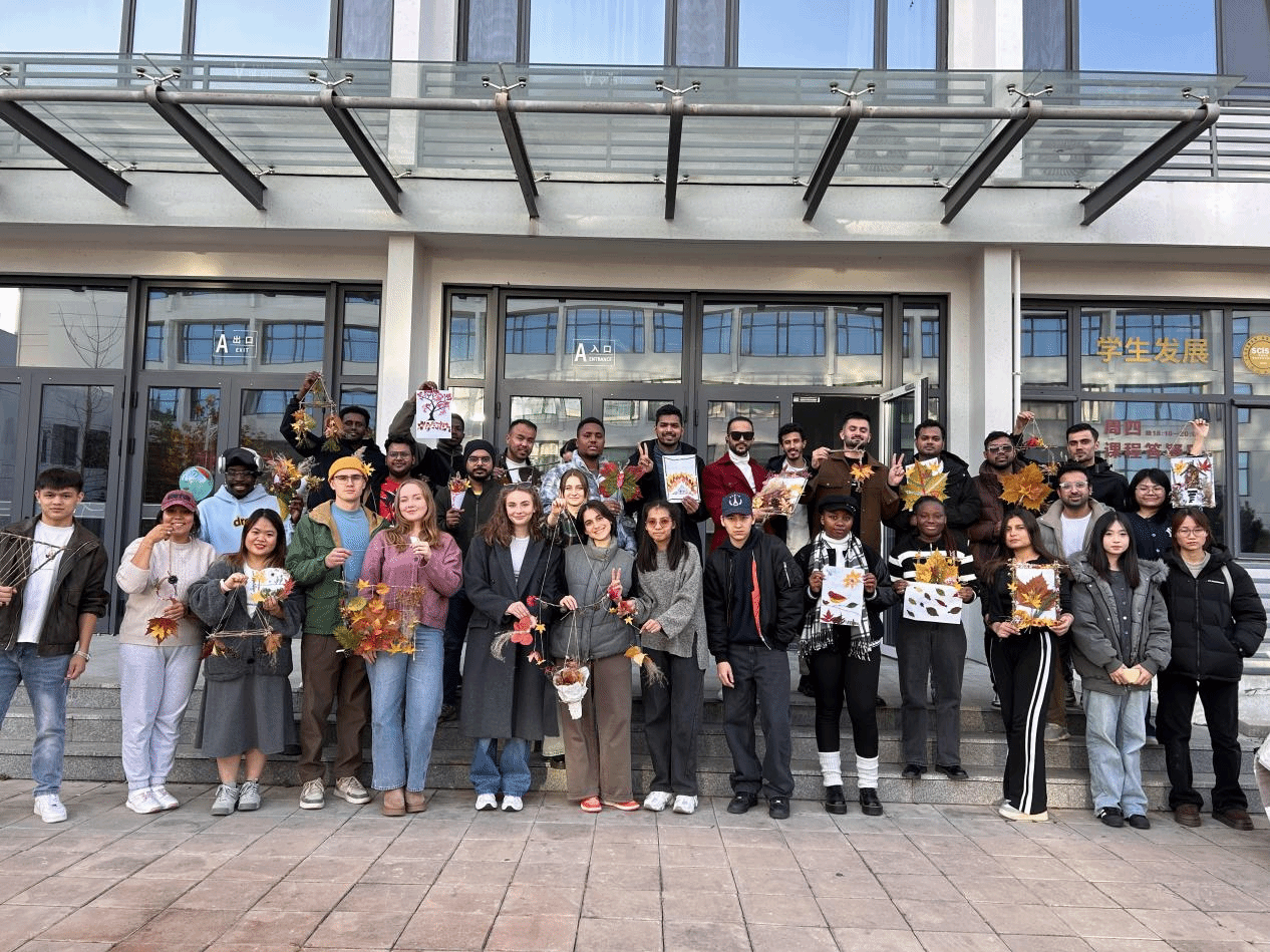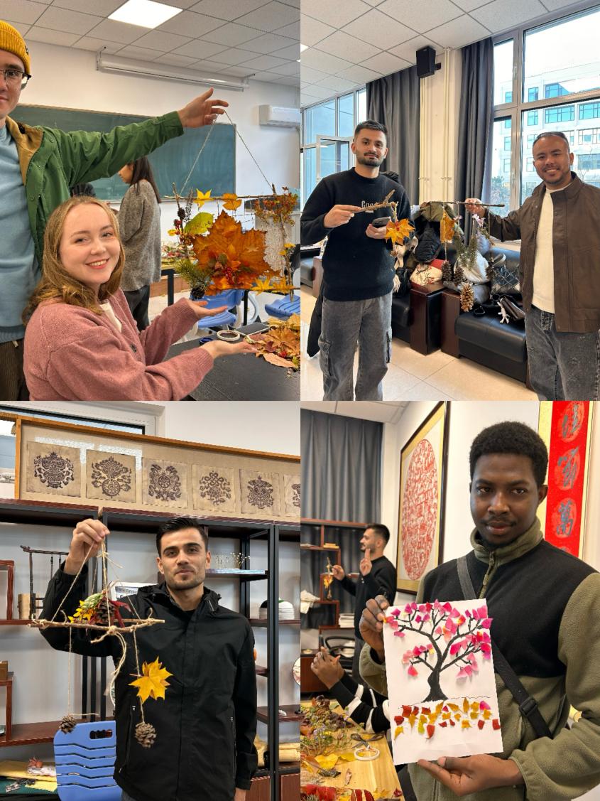 2025年11月9日,国际教育学院(欧洲学院)联合燕山大学民间印象手工坊,以“五育并举・以美润心”为主题开展心理健康教育活动。活动将劳动实践与艺术创作深度融合,组织来自不同国家的国际学生走出课堂、走进校园,在寻觅秋日自然馈赠、用落叶与树枝等天然素材创作手工作品的过程中,沉浸式感受自然之美。