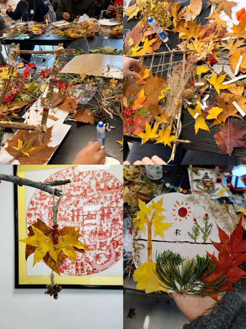 活动前期,国际学生们漫步校园的林荫道、景观区,弯腰捡拾形态各异的落叶与枯枝。金黄的银杏叶、泛红的枫叶、纹理独特的枝丫,都成为大家眼中的“艺术原料”。捡拾过程中,同学们相互分享发现的 “宝贝”,在亲近自然的过程中放松身心,感受校园秋景的静谧与灵动,为后续创作积累了丰富素材。