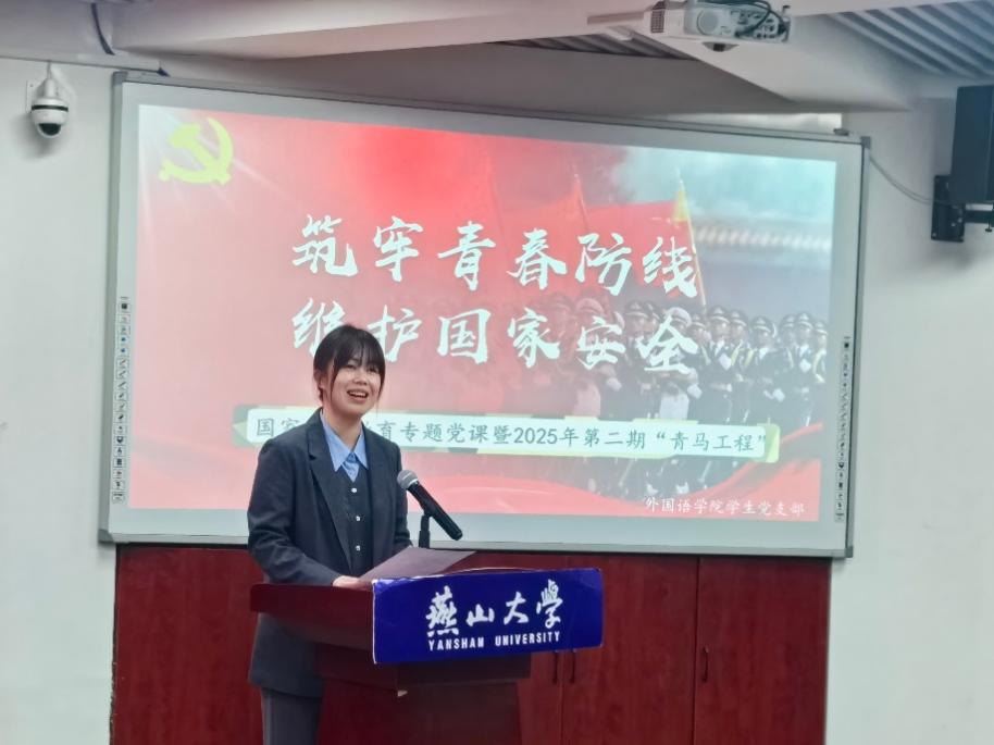 为深入贯彻落实总体国家安全观,切实增强青年的国家安全意识和素养,筑牢思想防线,外国语学院于12月4日16:00在第三教学楼320开展“筑牢青春防线,维护国家安全”国家安全教育专题讲座暨2025年第二期“青马工程”培训活动。讲座邀请秦皇岛市国家安全局专家担任主讲,各年级学生干部、信息观察员代表及外国语学院第二期“青马工程”学员参加,学院团委书记宋冉主持。