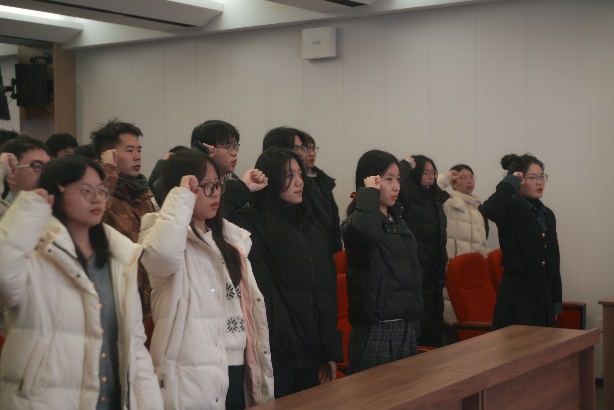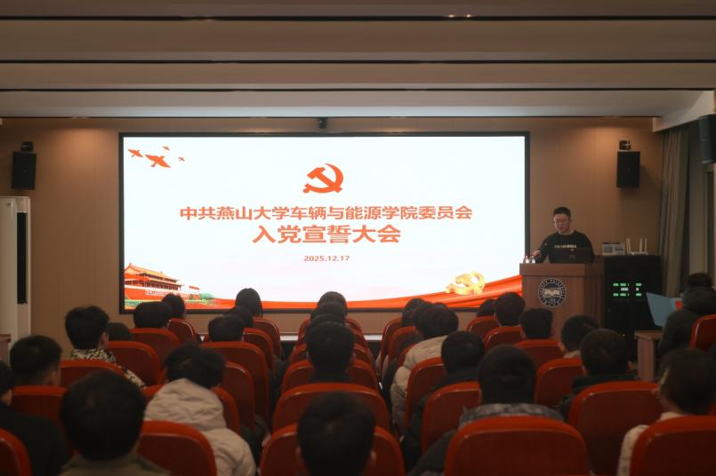 2025年12月17日晚,车辆与能源学院举行2025年度新党员入党宣誓大会,由学院党务中心主任袁宇晨主持,学院党务中心指导老师朱银玲、本科生第三党支部书记李洪庆老师出席,2025年度学院的55名新入党学生党员参加。