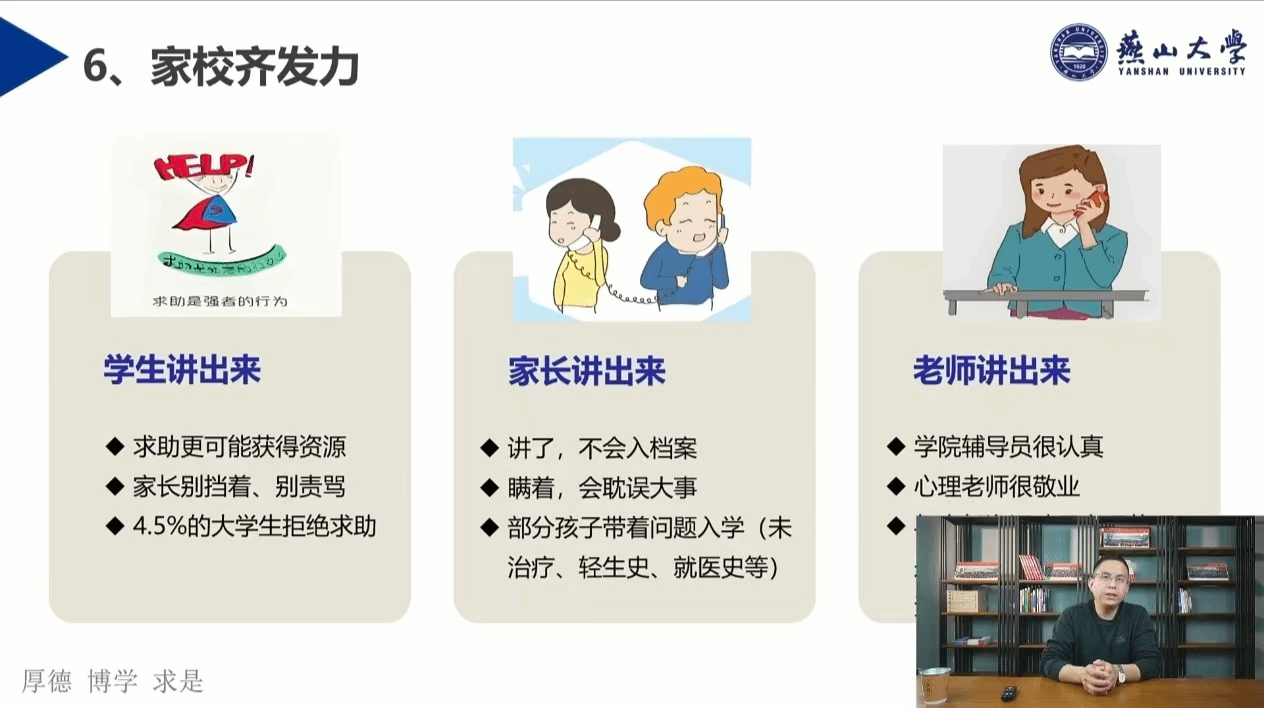为加强家校协同,共同守护大学生心理健康,3月25日晚7:00,燕山大学西里西亚智能科学与工程学院通过线上直播平台举办“家校同心,守护心灵——新时代大学生亲子沟通与心理健康指导”专题讲座。本次讲座特邀燕山大学学生工作处心理健康服务中心主任陶建刚担任主讲,吸引了800余名家长及师生在线观看。