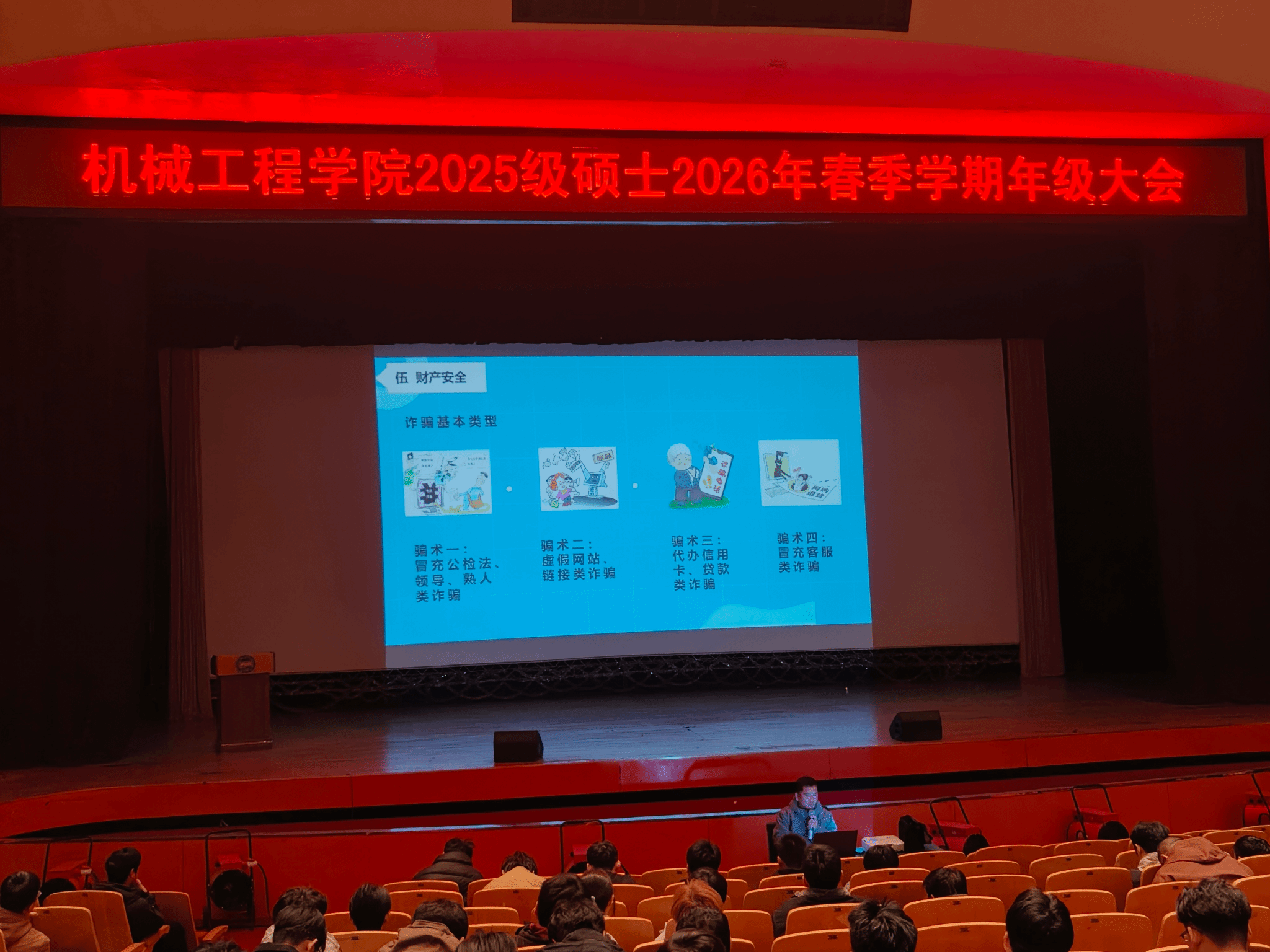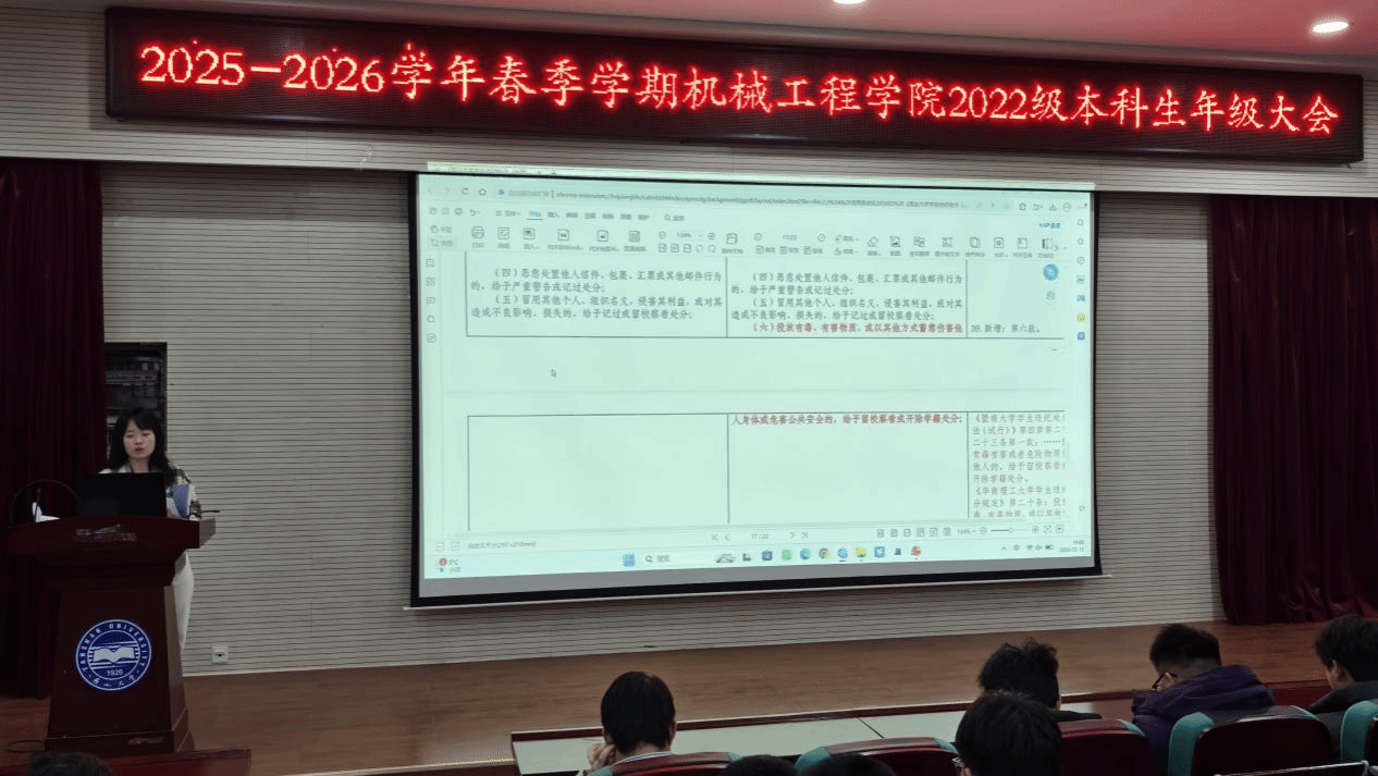 新学期伊始,为推动各项学生工作高效落地,助力全体学生尽快收心归位、调适学习生活状态,机械工程学院组织召开春季学期年级大会。会议从身心安全、消防安全、交通安全、言行安全、诈骗防范、保密专题六个模块展开,结合警示案例与校园管理新规开展系统宣讲,同时精准对接不同年级学生的成长特性与阶段性发展关键节点,量身定制差异化专项教育引导方案,多措并举夯实育人根基,为学生的健康成长与全面发展保驾护航。
