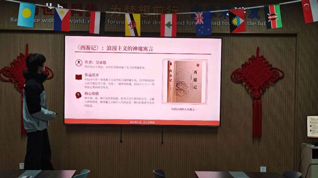 活动核心环节分为中国经典与外国经典两大板块。陈城睿聚焦《红楼梦》《西游记》等中国经典,从作者背景、作品简介、核心价值多维度展开讲解;同时选取《哈姆雷特》《百年孤独》等外国巨著,深挖作品背后的思想内涵,带领同学们沉浸在文学盛宴中。此外,他还围绕“阅读的意义与价值”展开分享,分享经典阅读对提升思维、塑造人格、培养人文素养的重要作用,以及在传承文化、丰盈内心方面的积极影响。