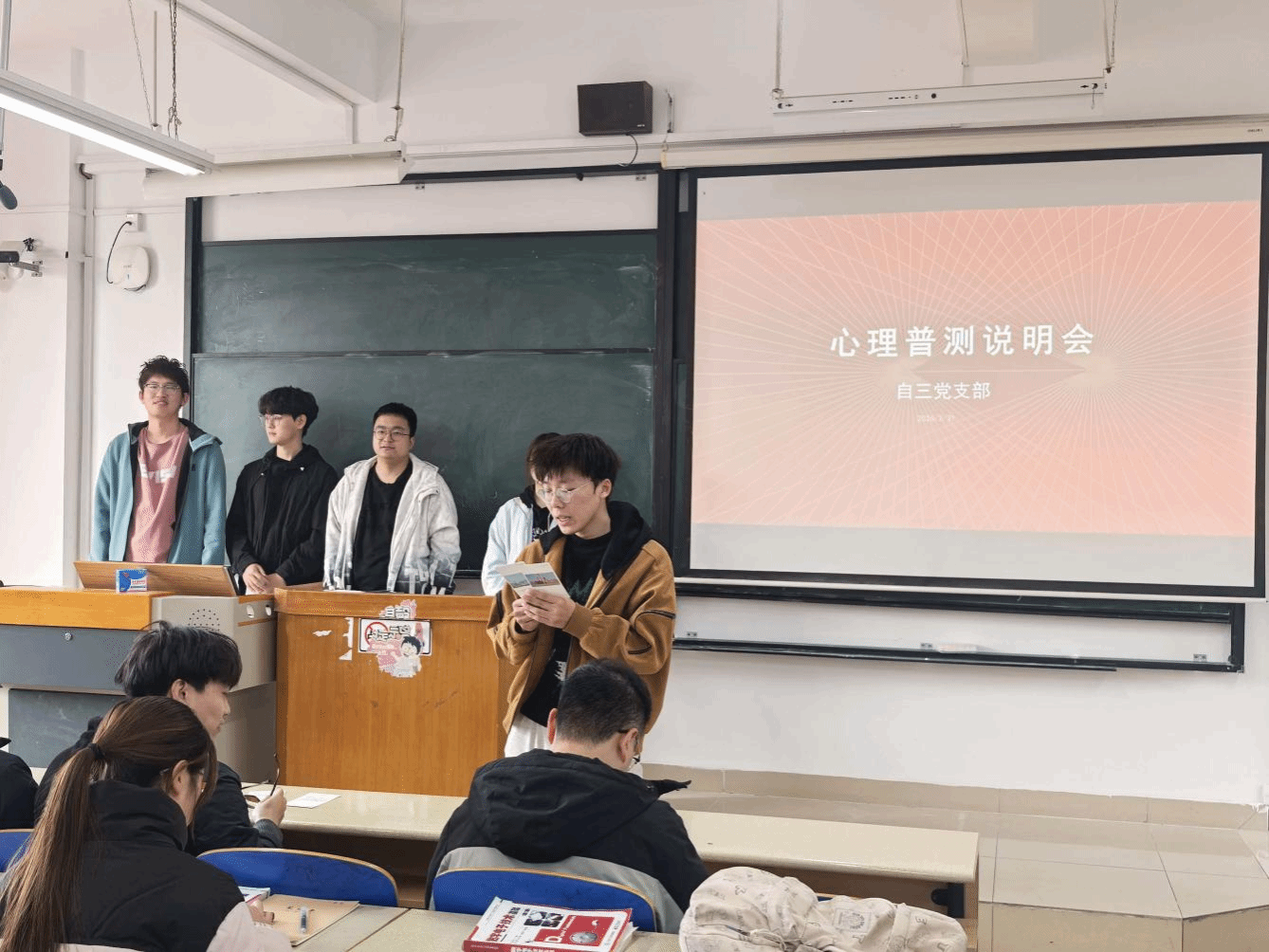 讲解结束后,党支部入党积极分子代表为24级测控专业的同学们送上了提前手写的心理健康主题祝福贺卡。作为本次朋辈心理指导活动的核心环节,支部党员们结合自身专业学习与成长经历,围绕自我接纳、焦虑缓解、学业规划、情绪管理等主题,写下专属暖心寄语。一字一句间,既有直面成长困惑的温柔劝慰,也有贴合专业的实用建议,更有来自学长学姐的真诚鼓励,让每一张贺卡都成为一份专属的“心灵治愈礼”,现场送到每一位同学手中。